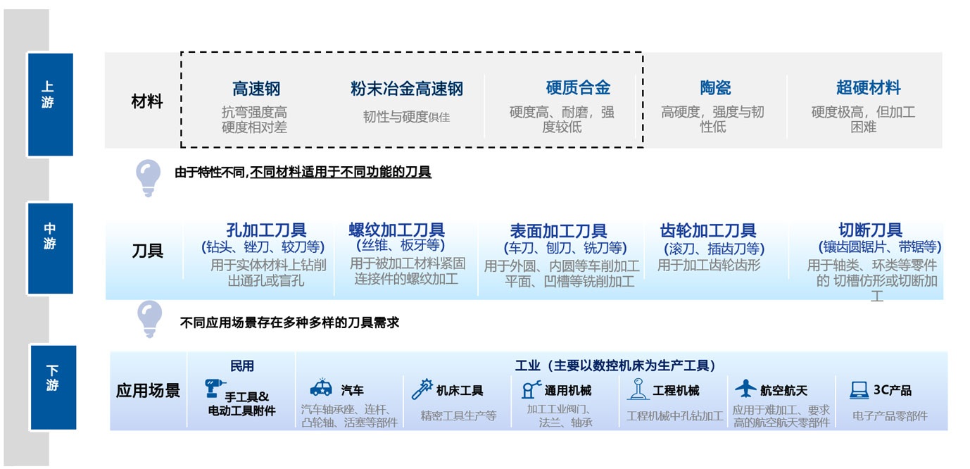 硬質合金刀具涵蓋整體硬質合金立銑刀鑽頭、鉸刀、成型刀、高光刀等。 產品廣泛應用於合金鋼、模具鋼、銅、鋁以及不銹鋼、高溫合金、鈦合金、高强度鋼、碳纖維等資料的加工,以及航空、航太、汽車、高速列車、石油化工、機械加工、醫療器械、軍工等不同領域。