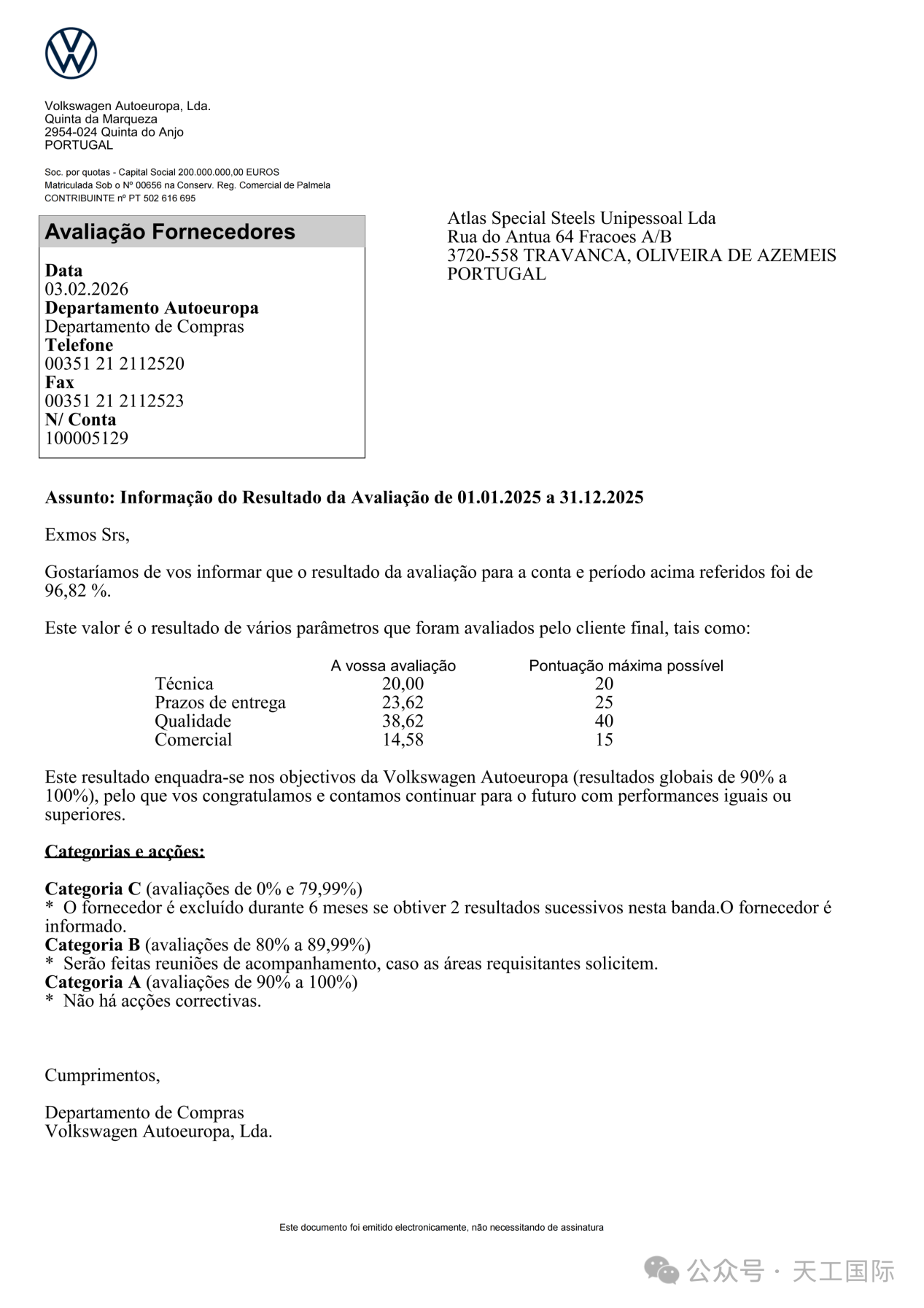 實力加冕,不负信赖!近日,天工國際特約經銷商Atlas Special Steels Unipessoal Lda(簡稱"Atlas")收到大眾汽車葡萄牙工廠的供應商評估通知,天工國際供應的產品,助力Atlas以96.82%的優異得分評為大眾汽車2025年度A級供應商!公司產品完美契合大眾汽車對全球供應商產品要求的核心目標,標志著天工國際產品品質與技術實力,獲得國際頭部汽車企業的高度認可!
