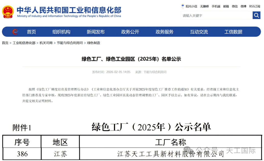 近日,工業和信息化部正式公示“綠色工廠、綠色工業園區(2025年)名單”。 天工國際旗下江蘇天工工具新材料股份有限公司(以下簡稱:天工工具新材料)憑藉扎實的綠色生產基礎、先進的環保技術實力以及堅定的低碳發展理念,成功入選國家級綠色工廠! 這一榮譽不僅是國家對企業綠色製造水准的高度認可,更是公司深耕綠色發展、踐行高品質發展理念的生動見證。