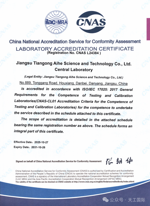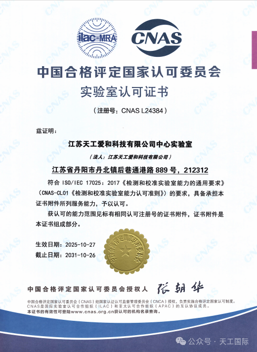 近日,中國合格評定國家認可委員會(CNAS)正式授予江蘇天工愛和科技有限公司中心實驗室(天工愛和中心實驗室)國家認可實驗室資質,認可註冊號為 CNAS L24384。這一資質的取得,標誌著天工愛和在實驗室管理體系建設、技術能力與檢測水平方面已全面達到國家及國際認可標準,具備出具權威、準確和國際互認的檢測數據的能力。